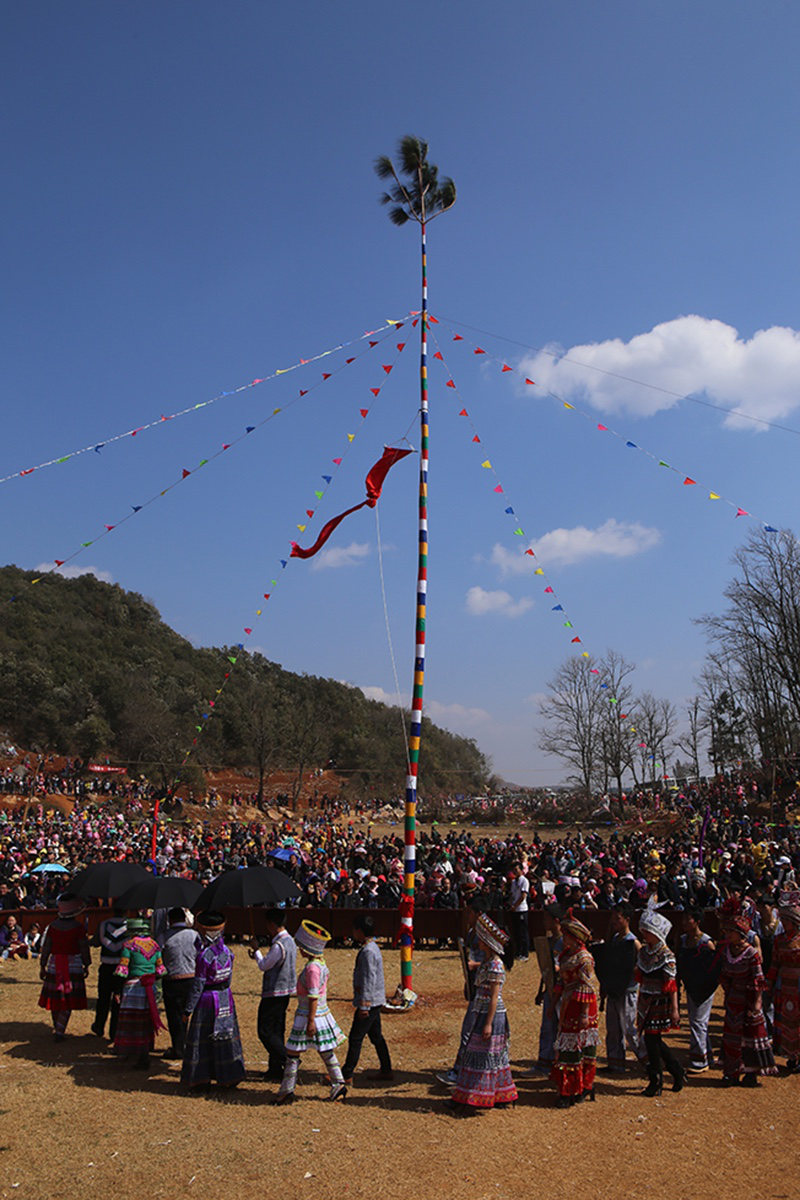 在苗族最盛大的節(jié)日花山節(jié)舉辦之際,苗族人都會來到幾個苗寨之間的開闊坡地——花山場上,圍著花桿舉行各種活動:祭祀、跳蘆笙、集市、對歌、踢腳架、斗牛、打木秋等。2016年2月8日到14日,云南省文山壯族苗族自治州丘北縣的大布紅村,舉辦了歷年來最盛大的一次花山節(jié)。我們有幸用紀(jì)錄片的方式,將它記錄了下來。