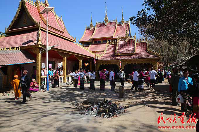 生活在我國西南邊疆的布朗族節(jié)日期間要舉行很多文化活動,布朗族同胞與親朋好友相聚一堂,品嘗美味佳肴并舉行歌舞表演。臨近中午,位于曼夕村前山頂?shù)乃聫R已人頭涌動,院子里人們圍成圈邊打鼓邊跳舞,緩緩移動的優(yōu)美舞姿成為一道靚麗的風(fēng)景。