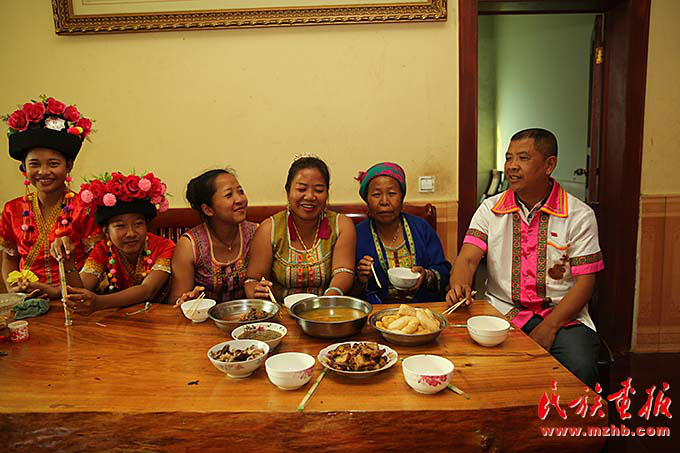 在曼夕村,民族傳統(tǒng)節(jié)日已成為不同民族間聯(lián)絡(luò)增進感情的最佳時機。曼夕村村主任車達告訴記者,他自己是哈尼族,村里還有漢、布朗、哈尼等民族。40多年前,為了種植橡膠樹布朗族與彝族遷徙過來生活在一起,幾十年來,兩個民族相互尊重對方的生活習(xí)慣,過年過節(jié)相互走動拜訪,互相通婚成為一家人。晚飯時,記者在曼夕村村支書巖坎硝家里聚餐時看到車達帶著幾個哈尼族婦女盛裝出席,宴會上人們相互祝賀,唱敬酒歌。哈尼族婦女圖處告訴記者,哈尼族過傳統(tǒng)節(jié)日,布朗族村民要來慶賀,布朗族過節(jié),哈尼族人也去祝福,幾十年來一直如此。
