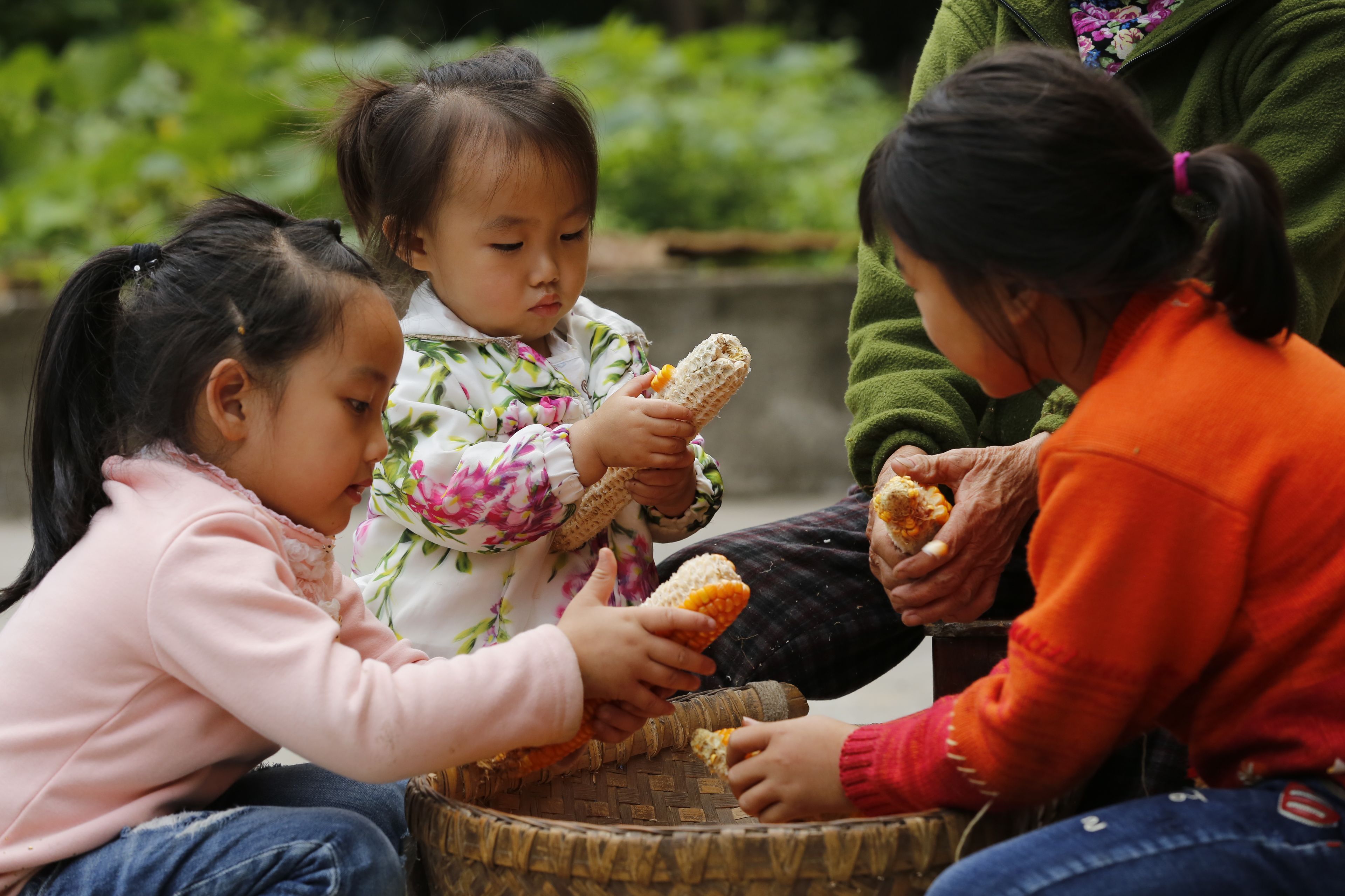 貴州貴陽苗族日常生活-老年人與兒童剝玉米