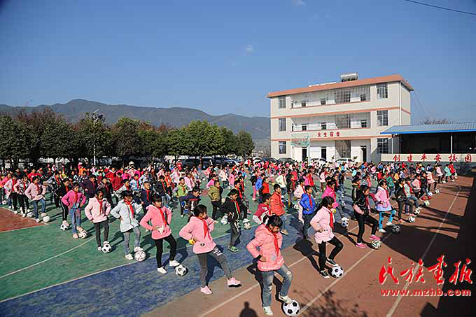 在新村聯(lián)排別墅的最南邊是中村鄉(xiāng)小學(xué),這所學(xué)校是同傈園新村相依而伴建在一起的。上午十點(diǎn),課間操的鈴聲打破了新村的寧靜。學(xué)生們歡快地沖出教室,每人手捧足球,來到操場。在老師統(tǒng)一的號令下,孩子們跳起了足球課間操。歡快的音樂旋律,伴著運(yùn)球、帶球等不同的動作,孩子們的天真爛漫得到了充分詮釋。小學(xué)校長張世喜看著學(xué)生們歡樂的表情,高興的表情溢于言表。他說:“孩子們太幸福了?!?6年前,張世喜從楚雄師院畢業(yè)回到了家鄉(xiāng)的中村鄉(xiāng)峨山村委會小學(xué),“場是土巴地,籃球架是用兩棵大樹做成的,教室里的桌椅高矮不一,找不到品相相同的兩張課桌,孩子們的宿舍是兩三個人擠一張床……”回憶起那時情景,張世喜記憶猶新。 “現(xiàn)在好了,住宿生縣財政每月每人都要補(bǔ)貼100元伙食費(fèi),孩子們頓頓有肉吃了,還為我們建起了兩棟宿舍樓,268名住宿生每人一張床,再也不用擠著睡了?!睆埵老舱f,在這樣的辦學(xué)條件下,我們工作越來越有激情了。
