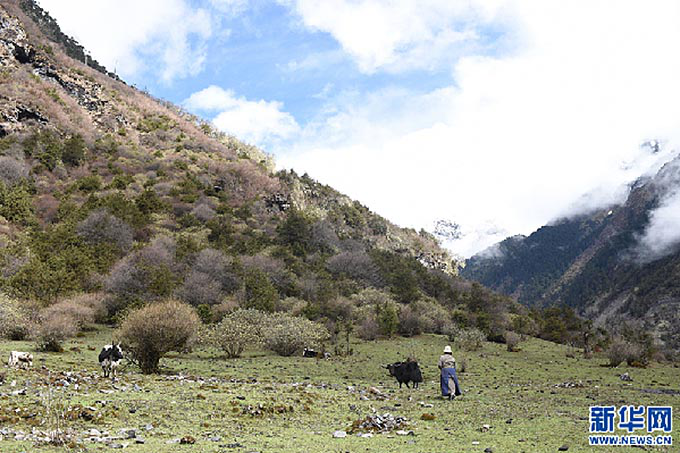 2018年5月9日,跟隨“新時代·幸福美麗新邊疆”網(wǎng)絡(luò)主題活動的隊伍,記者來到玉麥,見到了卓嘎本人。從北京回到玉麥的卓嘎,又變回了那個樸實的放牧守邊人。見到卓嘎時,她正拿著飼料準備去山上的草場喂牛。這也是她每天最忙碌的時刻。