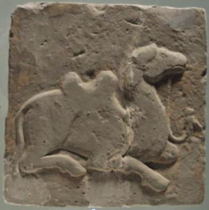 邊長30.5厘米,厚5厘米,呈方形。畫面中央為一人用手托舉鳥籠圖。人物以浮雕的方法突出總體輪廓,衣飾細(xì)部花紋則用線刻,腿部和臂部的肌肉繃起,形成了合理的藝術(shù)夸張。