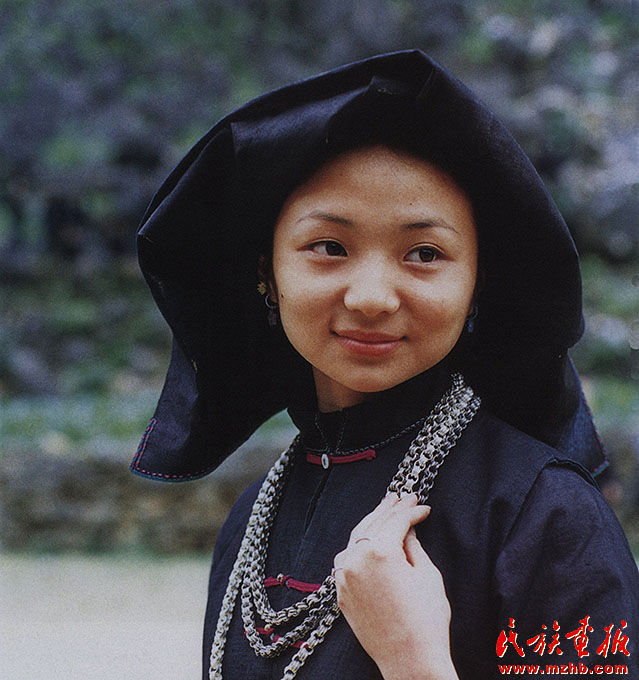 婦女的服飾更具特點(diǎn),無論老少,都喜歡穿右蓋大襟和葫蘆狀矮腳圓領(lǐng)的緊身短式上衣,下身以寬褲腳、大褲頭的褲子相搭配,腰系黑布做成的大圍裙,頭帶黑布大頭巾。其圍裙既寬且長,戴時(shí)能系周身有余,裙底垂掛到小腿下部,圍裙不僅作為裝飾,而且可以作為勞動工具,遇趕圩或走親訪友和勞動時(shí),可將圍裙底翻卷上來作成小包袱,用以包裝和盛裝物品。婦女頭巾都是一塊自己紡織染成的長條黑布,戴時(shí)先圍繞在頭上,然后翻折擺布成火棱形的圖樣,罩在整個頭上,再把頭巾的兩端分別垂掛到雙肩上,看上去樸素美觀。同時(shí)還可以當(dāng)做帽子遮蔭用。她們的衣邊、衣角、袖口、裙邊和頭巾的四邊都用紅布或黃布剪成小條以后鑲捆上去,有的則用紅、黃、藍(lán)色絲線繡成波浪形的線條,使黑中襯出紅、黃、藍(lán)色的線條來,清雅明亮,色彩協(xié)調(diào)。再加上頭發(fā)插著龍頭形的銀簪,頸項(xiàng)上帶有銀鏈或項(xiàng)圈,手帶銀圈、玉鐲,耳掛珍珠耳環(huán)等,使人一看,黑中閃艷,樸素之中亦有玲瓏之美,表現(xiàn)了她們獨(dú)特的審美觀。