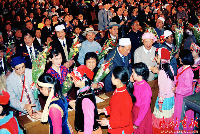 1988年4月25日至29日,首次全國(guó)民族團(tuán)結(jié)進(jìn)步表彰大會(huì)在北京舉行,圖為大會(huì)現(xiàn)場(chǎng).《民族畫報(bào)》1988年第8期