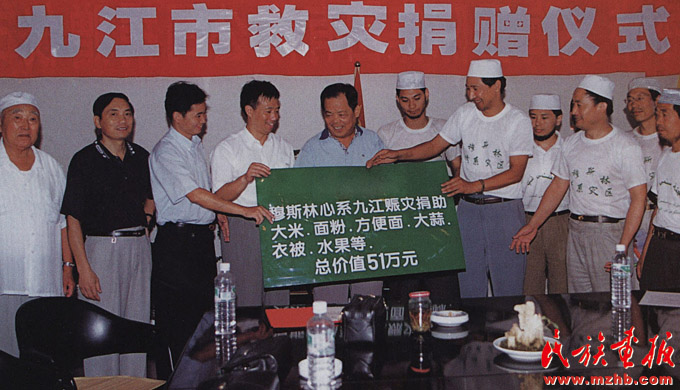1998年,長(zhǎng)江發(fā)生了全流域的特大洪水,災(zāi)情牽動(dòng)著全國(guó)各族人民的心,舉國(guó)掀起了“情系災(zāi)區(qū)、奉獻(xiàn)愛心”的賑災(zāi)熱潮。圖為回族企業(yè)代表在江西省九江市政府舉行捐贈(zèng)儀式?!睹褡瀹媹?bào)》1998年第12期