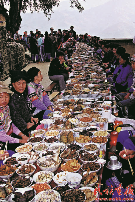 經(jīng)過近30年的改革開放,各族人民的生活發(fā)生了翻天覆地的變化。圖為2005年哈尼族在年節(jié)時(shí)擺的長(zhǎng)街宴,席間有許多民族特色佳肴。最長(zhǎng)的云南紅河州綠春縣的長(zhǎng)街宴在2004年被載入世界吉尼斯紀(jì)錄《民族畫報(bào)》2005年第2期