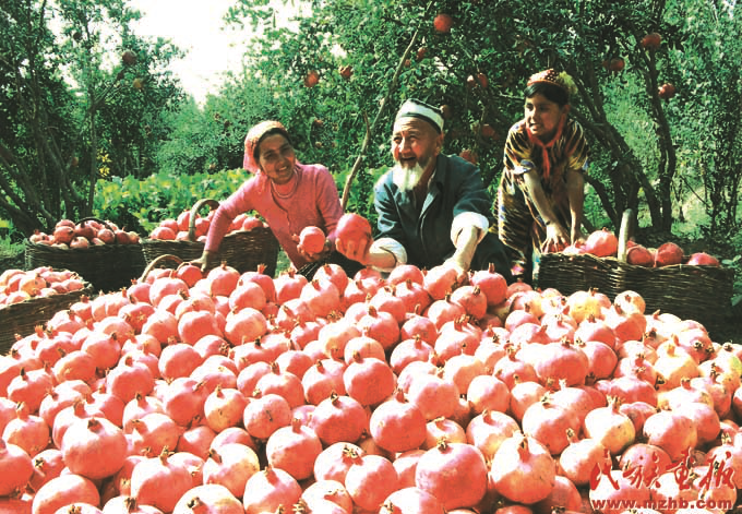 興邊富民行動(dòng)是1999年中央民族工作會(huì)議部署的一項(xiàng)重要的邊境建設(shè)工程,旨在“富民、興邊、強(qiáng)國(guó)、睦鄰”。興邊富民行動(dòng)為新疆的發(fā)展帶來了實(shí)惠,2006年,看著豐收的石榴,維吾爾族農(nóng)民樂開了花。《民族畫報(bào)》2007年7期