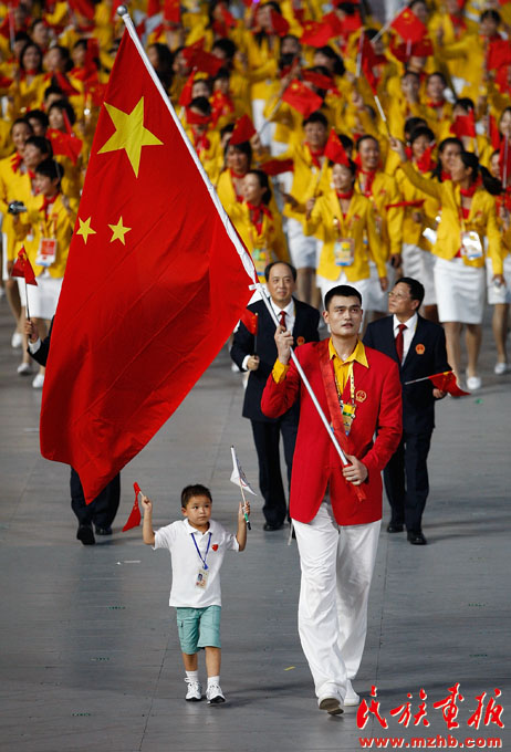 2008年8月8日,全國(guó)各族人民期盼已久的第二十九屆奧林匹克運(yùn)動(dòng)會(huì)在北京隆重開幕,圖為北京奧運(yùn)會(huì)中國(guó)代表團(tuán)入場(chǎng)儀式上,運(yùn)動(dòng)員姚明領(lǐng)著汶川大地震中最小的救人英雄林浩入場(chǎng)。《民族畫報(bào)》2008年第9期
