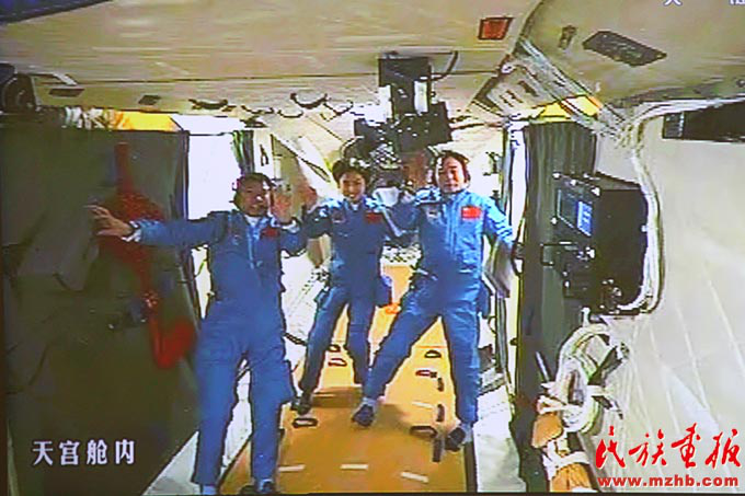 2012年6月18日,神舟九號(hào)飛船與天宮一號(hào)完成自動(dòng)交會(huì)對(duì)接,兩飛行器形成穩(wěn)定運(yùn)行的組合體后,三位航天員先后進(jìn)入天宮一號(hào)目標(biāo)飛行器,這實(shí)現(xiàn)了中國(guó)載人航天歷史上首次對(duì)一個(gè)在軌運(yùn)行的航天器的拜訪和駐留。圖為在北京航天飛控中心大屏幕拍攝到的航天員景海鵬、劉旺、劉洋在天宮一號(hào)實(shí)驗(yàn)艙內(nèi)的畫面?!睹褡瀹媹?bào)》2012年第7期