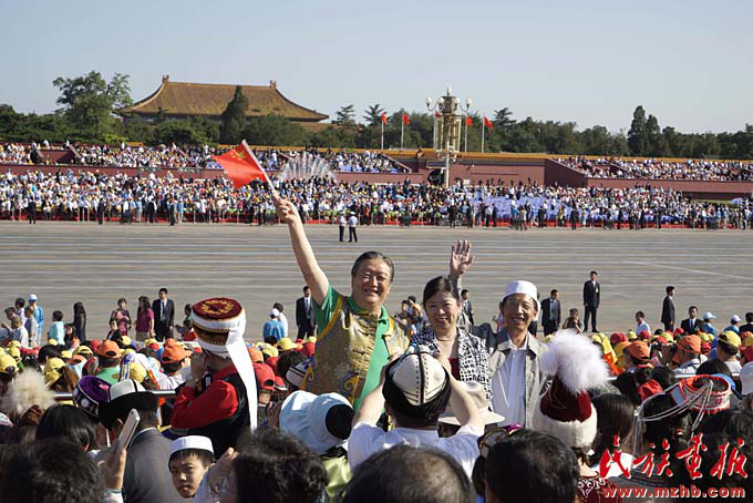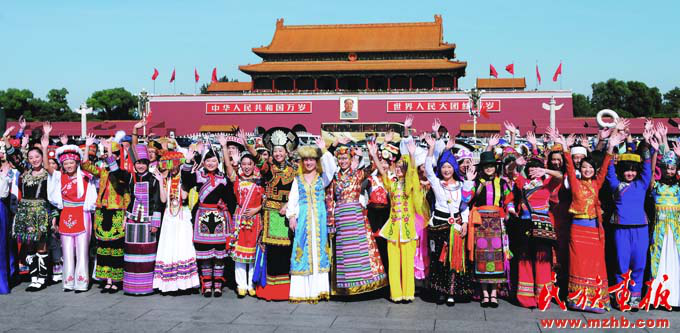 新中國(guó)成立以來,黨和國(guó)家始終堅(jiān)持把馬克思主義民族理論同中國(guó)民族問題具體實(shí)際相結(jié)合,始終堅(jiān)持把民族工作作為一項(xiàng)重大工作來抓,團(tuán)結(jié)帶領(lǐng)全國(guó)各族人民共同團(tuán)結(jié)奮斗,共同繁榮發(fā)展,開創(chuàng)了中國(guó)特色解決民族問題的正確道路,取得了舉世矚目的成就,積累了彌足珍貴的成功經(jīng)驗(yàn)。2009年10月1日,在北京天安門廣場(chǎng),20萬軍民以盛大的閱兵儀式和群眾游行歡慶新中國(guó)60華誕,圖為各民族學(xué)生參加“團(tuán)結(jié)奮進(jìn)”方陣群眾游行。《民族畫報(bào)》2009年第10期