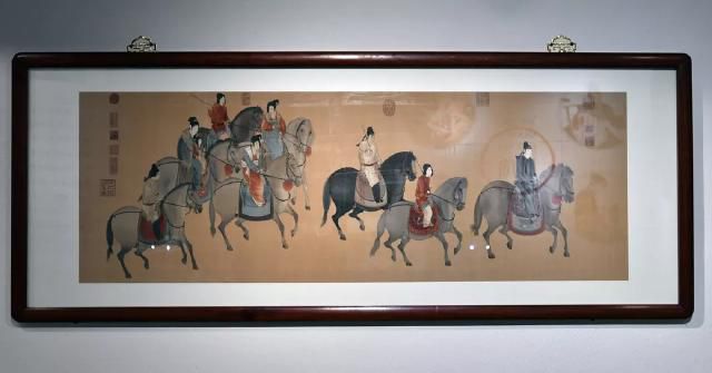 取材于唐代畫(huà)家張萱的畫(huà)作《虢國(guó)夫人游春圖》和《簪花仕女圖》,作品采用橫織豎裱的方式呈現(xiàn)。