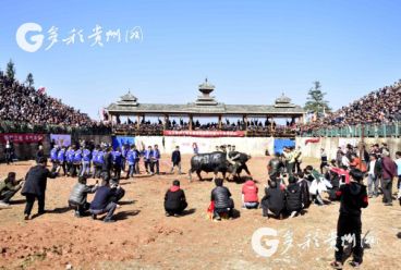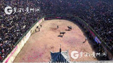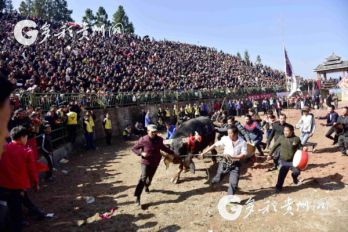 貴州省從江縣第十五屆原生態(tài)侗族大歌節(jié)的前一天,恰逢該縣逢亥斗牛日,丙妹鎮(zhèn)松學斗牛塘、谷坪鄉(xiāng)四寨河斗牛塘同時舉辦傳統(tǒng)牛王爭霸賽,喜迎一年一度“侗族大歌節(jié)”的到來,共有來自周邊村寨的80頭水牯牛參戰(zhàn),斗牛活動場上名牛角逐,場面異彩紛呈,吸引數(shù)萬名觀眾前來觀戰(zhàn)。