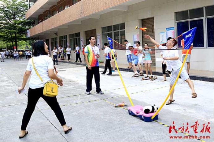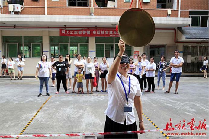 趣味運動會結合民族地區(qū)開展的傳統(tǒng)體育項目,以及趣味競技游戲等,展示了少數民族傳統(tǒng)體育特色,如盲敲銅鑼和高蹺便是利用了民族地區(qū)的一些傳統(tǒng)活動改編而來的,另外還有團隊協作的民族民間運動項目手毽、拔河和板鞋競速等。200余名各族群眾參加了這些帶有濃厚民族特色的運動項目。