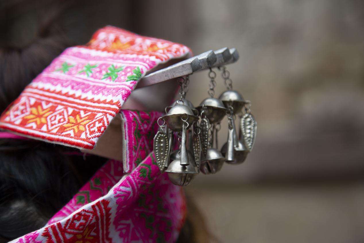 在身后可以看見圍腰下的藍(lán)色百褶裙,百褶裙上有波浪線條狀花紋,面積較小,百褶裙大部為藍(lán)色。女子有綁腿習(xí)俗,綁腿帶也是藍(lán)色,與服飾顏色相呼應(yīng)。女子頭飾往往以紅色布帶裹頭,用銀簪束發(fā)?!?/p>