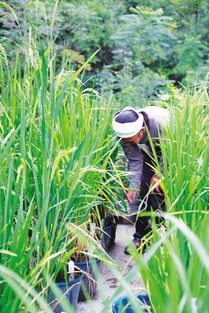 拜訪期間,我住在黎友明家的二樓,不大的廳堂連著一片寬闊的陽臺(tái),上面擺放著幾十個(gè)水桶,里面種著水稻。我第一次看見這樣用水桶種稻。正值盛夏,幾十個(gè)水桶爭(zhēng)相涌出綠波,有的已經(jīng)出穗了,細(xì)小的白花推擠著綻放,有的還渾身只著綠衣;有的稻穗很高,有的葉子短小,還有紅葉子的,稻芒長(zhǎng)長(zhǎng)的……在黎友明的提醒下,我才恍悟過來:每個(gè)桶里都種著不同的老品種水稻,因此,它們的稻穗和葉子都不盡相同。