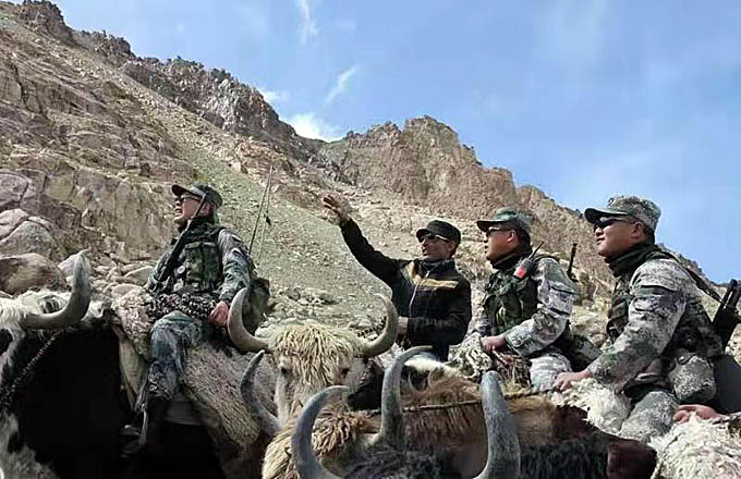 拉齊尼·巴依卡與紅其拉甫巡邏官兵騎著牦牛巡邏。(新華社記者 李翔 攝影)