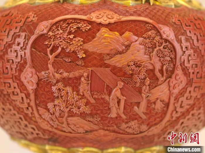 本次展出的乾隆款剔紅開光山水人物紋龍耳瓶為乾隆年間制作,是漆器與金屬工藝相結(jié)合的產(chǎn)物。乾隆時(shí)期,國(guó)力昌盛,加之乾隆帝本人的喜好和干預(yù),造辦處使用“牙作”匠人承擔(dān)漆器雕刻,因而器物畫面帶有雕工精致、層次豐富、轉(zhuǎn)角凌厲的鋒棱之美,且紋飾寓意吉祥美好,還常常與描金、鑲嵌等工藝相結(jié)合。