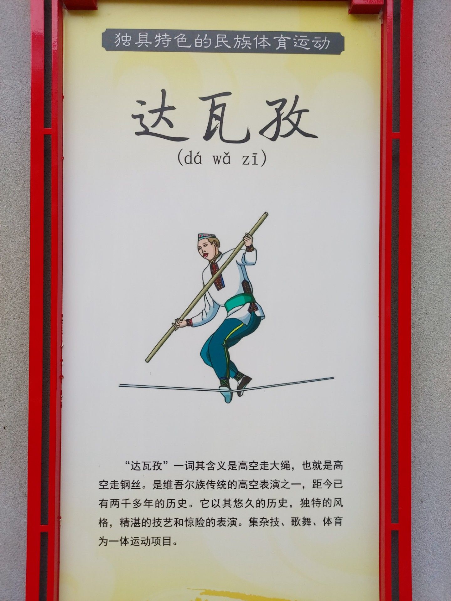 “達瓦孜”一詞其含義是高空走大繩,也就是高空走鋼絲。是維吾爾族傳統(tǒng)的高空表演之一,距今已有兩千多年的歷史。它以其悠久的歷史,獨特的風(fēng)格,精湛的技藝和驚險的表演。集雜技、歌舞、體育為一體運動項目。