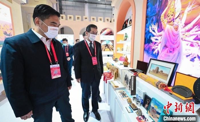 圖為甘肅省副省長孫雪濤(左)與甘肅省文化和旅游廳廳長陳衛(wèi)中(右)一同參觀“甘肅館”。 甘肅省文化和旅游廳供圖