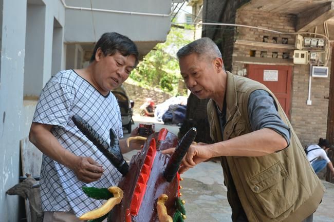 家住鎮(zhèn)遠縣?陽鎮(zhèn)東關社區(qū)的皇安東,今年68歲,雖然年近古稀,但精氣神堪比五十來歲的中年人,皇安東介紹由于個人愛好,8歲時與龍舟接下了深厚的情緣,對“龍”文化研究的執(zhí)著像一如往日對戀愛的投入充滿激情和憧憬一樣,經過60多年的龍舟文化研究探索,他手工雕刻的龍頭威武靈動融匯鎮(zhèn)遠傳統(tǒng)文化精髓,“鎮(zhèn)遠賽龍舟”已被列為國家非物質文化遺產項目名錄?;拾矕|49歲開始自學雕刻龍頭,鎮(zhèn)遠端午節(jié)每年祭祀用的龍頭幾乎出自他手,雕刻的龍頭已上數(shù)百頭。當筆者提到皇安東為何歷經六十多年對雕龍頭的“手藝”癡心不改時,他笑著爽朗地說:“我一生雕龍頭,主要的精神動力是對鎮(zhèn)遠傳統(tǒng)龍舟文化的熱愛和傳承。”皇安東一家人整天在“龍”的藝術空間里過得有滋有味。