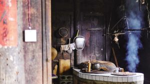 鏡頭的取景框內(nèi),青菜在“古井”潺潺流水中淌去泥沙,沿著苔蘚步道,裝在背簍里被送入小院;陽(yáng)光透過窗欞灑下,熏黑的灶臺(tái),柴火劈啪作響,趁著火候,幾下翻炒,白霧便混合著農(nóng)家飯香騰騰升起。