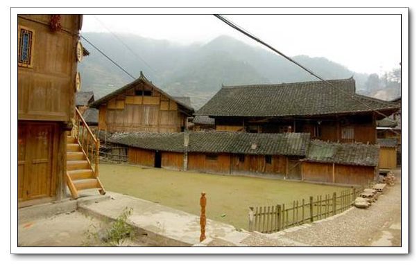 苗族山寨,村民居住的是吊腳樓。苗族大多居住在高寒山區(qū),山高坡陡,平整、開挖地基極不容易,加上天氣陰雨多變,潮濕多霧,磚屋底層地氣很重,不宜作息起居。因而,苗族山寨歷來依山抱水,能工巧匠用本地盛產(chǎn)的杉木,構(gòu)筑一種通風(fēng)性能好的干爽的木樓,叫“吊腳樓”。苗族的吊腳樓建在斜坡上,把地削成一個(gè)“廠”字形的土臺(tái),土臺(tái)下用長木柱支撐,按土臺(tái)高度取其一段裝上穿枋和橫梁,與土臺(tái)平行。吊腳樓低的七、八米,高者十三、四米,占地八、九十個(gè)平方米。屋頂除少數(shù)用杉木皮蓋之外,大多蓋青瓦,平順嚴(yán)密,大方整齊。吊腳樓一般以四排三至五間為一幢,有的除了正房外,外延還搭了一兩個(gè)“偏廈”。每排木柱一般9根,即五柱四瓜。每幢木樓,一般分三層,上層儲(chǔ)谷,中層住人,下層樓腳圍欄成圈,作堆放雜物或關(guān)養(yǎng)牲畜等。住人的一層,旁有木梯與樓上層和下層相接,該層設(shè)有走廊通道,約1米寬。堂屋是迎客間,兩側(cè)各間則隔為二三小間為臥室或廚房。房間寬敞明亮,門窗左右對(duì)稱。有的苗家還在側(cè)間設(shè)有火坑,冬天就在這燒火取暖。中堂前有大門,門是兩扇,兩邊各有一窗。中堂的前檐下,都裝有靠背欄桿,俗稱“美人靠”。大多數(shù)吊腳樓在二樓地基外架上懸空的走廊,作為進(jìn)大門的通道。堂屋外的懸空走廊,安裝有獨(dú)特的s形曲欄靠椅,苗語叫“嘎息”(ghabxil),民間有一美稱叫“美人靠”,這是因?yàn)楣媚飩兂T诖思徏喛棽?、挑花刺繡,向外展示風(fēng)姿而得名。其實(shí)“嘎息”還用作一家人勞累過后休閑小憩、納涼觀景、講述傳承苗族神話和遷徙歷史,以及演唱《苗族古歌》、“嘎百福歌”的多功能涼臺(tái)。外設(shè)長廊、置板凳,便于夏夜乘涼、唱歌、閑聊。中廳設(shè)有火塘,置三腳灶,上部吊禾坑,烘烤谷物或其他食物?;鹛羶深^隔開作內(nèi)房,供住宿。