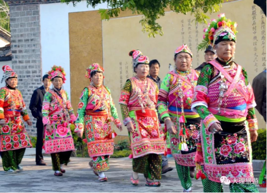 男子頭頂氈帽(又稱氈窩),穿大襟衣、大襠褲,赤足或穿草鞋,披羊皮,外出背皮袋(現(xiàn)已基本消失)。女子裹高包頭、額上飾銀桂花,衣為布襟,外套坎肩,腰系大圍腰,大圍腰左右下三邊繡五色花,為動植物圖案,足穿繡花鳳頭鞋,用本地產(chǎn)綠布條制褲子,不鎖腳邊,腰間背圓形白氈裹背,所穿服飾顏色鮮艷、質地厚重,盡顯遠古南詔皇室服飾遺風。