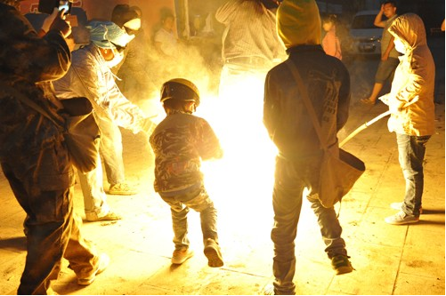 不到黃昏,鞭炮聲就響起來了。新生兒的父親點(diǎn)燃火把后,孩子們迫不及待地拿著小火把和松明粉,跑來跑去燒新生兒的的各種親戚,大人們樂呵呵地接受孩子們噴灑過來的火焰,并一致說著很吉祥的祈愿祝福語?!皬拇嘶逇獠辉趪D!”、“一年更比一年好呀!”、“紅紅火火又一年”。男女老少在火把樹下吃喝玩樂,其樂融融。糖、炒蠶豆、梨、蘋果等被大家傳來傳去,新生父親挨個(gè)向親友敬酒。親友鄰居喝著喜酒,一致祝福新生兒安康成長,將來富貴吉祥。