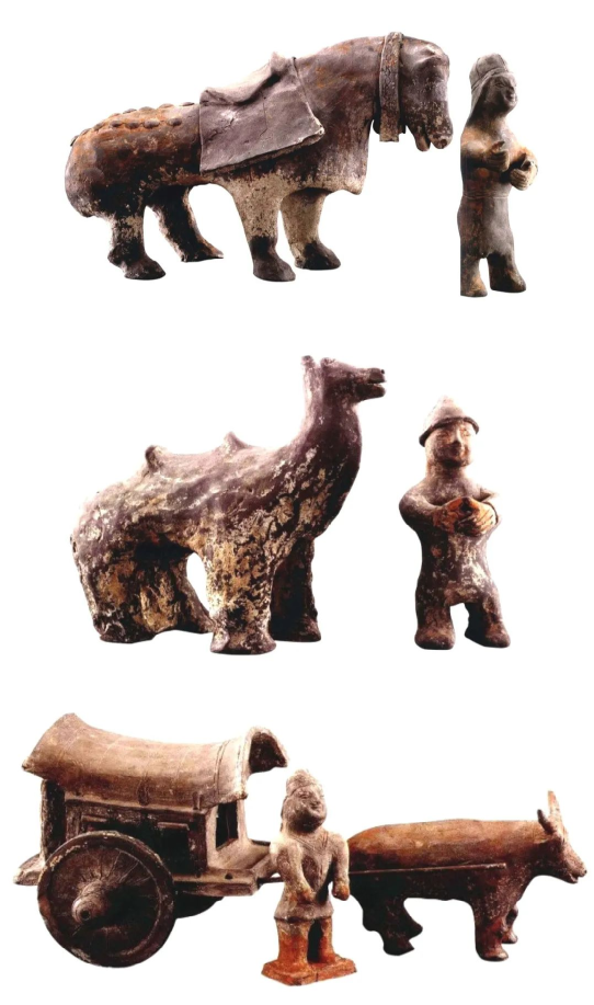 墓內(nèi)隨葬品有陶俑及陶生活器具、家禽及動物、牛車等明器。陶俑共15件,有武士俑、男女侍俑、樂舞俑等。生活器具有灶、磨、燈、罐等。家禽及牲畜類動物有豬、犬、雞、羊、馬、駱駝等。