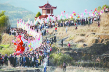 正月十五元宵夜,福建龍巖姑田鄉(xiāng)村,大龍翔游,看客云集。二百多節(jié)、千米長(zhǎng)的大龍,蜿蜒于鄉(xiāng)間村野,穿行于大街小巷,騰挪起伏,活靈活現(xiàn);一路上男女老少趨之若鶩,前后左右相隨,游龍隊(duì)伍浩浩蕩蕩達(dá)數(shù)里之長(zhǎng),熱鬧非常;所到之處,家家門前燃松明、點(diǎn)香燭、擺果茶、放爆竹,迎接“龍游大地,喜到人間”。