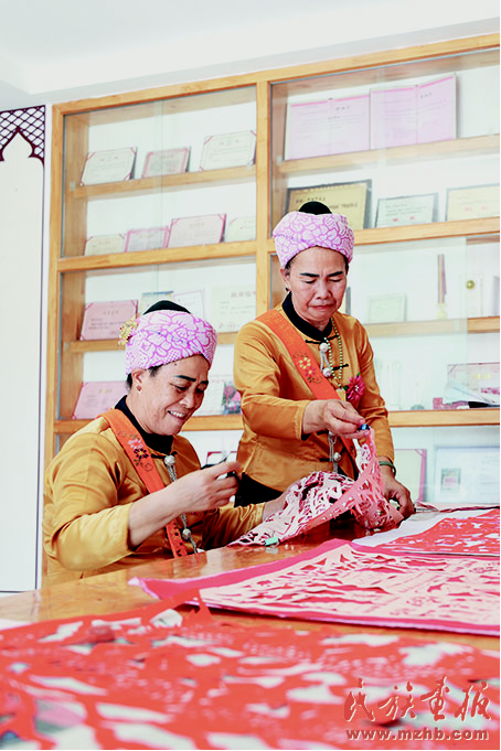 邵梅罕(右)與村民進(jìn)行剪紙技藝交流。