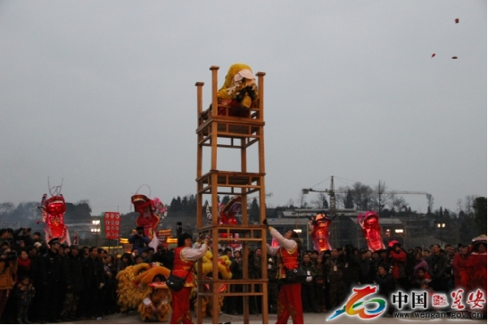 高臺是用5至7張八仙桌一層層疊壘,最上面的桌子四腿朝天,總高度近8米。四人登臺表演。兩個人扮獅子,把獅頭獅皮披在身上,只露雙腳;另外兩人分別裝扮成孫悟空和笑臉和尚揮舞手帕,大蒲扇逗引獅子逐層攀上高臺,為了穩(wěn)固,安全起見,每張桌子的四角都用草紙疊浸水后墊著防滑,做到萬無一失。