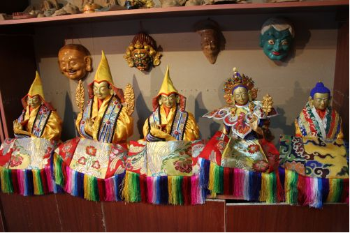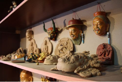 在普布次仁所在的公司里,有一個(gè)專(zhuān)門(mén)用來(lái)制作泥塑面具的房子,從外表上看去,它只是一個(gè)普普通通的藏式民居,但走進(jìn)其中,則別有一番天地。在房間里整齊擺放了大大小小的泥塑面具、佛像,這些手工藝品造型生動(dòng),每一件手工藝品仿佛都在訴說(shuō)著一個(gè)古老、動(dòng)人的故事。