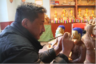 邊巴在對(duì)泥塑佛像上色。