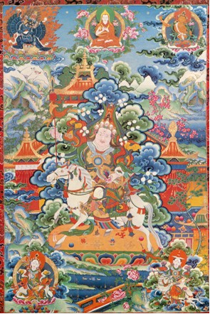 勉塘畫派是15世紀以后影響最大的繪畫流派,主要流行于衛(wèi)藏地區(qū)及昌都部分地區(qū)。該畫派的創(chuàng)始人是勉拉頓珠,他出生于洛扎勉塘(今山南地區(qū)),勉塘畫派由此而得名。他大約出生于公元十五世紀20年代或30年代。據(jù)史料記載,勉拉頓珠出生的時間正好與他家鄉(xiāng)發(fā)現(xiàn)了朱砂礦的時間一致。這種重要繪畫顏料的出現(xiàn),預(yù)示著一代繪畫大師降臨人世。他自幼聰慧,毫不費力地學(xué)完各種字體的書寫、大小五明中的絕大多數(shù)內(nèi)容。成年后,拜后藏一帶的著名美術(shù)大師多巴扎西杰布為師,苦心鉆研,在繪畫藝術(shù)領(lǐng)域取得了很深的造詣。通曉了藏、漢、印、尼泊爾等各種繪畫派別的技法,他根據(jù)《續(xù)部》等編寫了繪畫理論專著《造像量度如意寶》,并創(chuàng)立了勉塘畫派。他參與了一世達賴喇嘛根敦朱巴與1447年創(chuàng)建的扎什倫布寺措欽大殿壁畫繪制工程的全過程,單獨完成了北壁的《釋迦牟尼與十六羅漢圖》與《八十大成就者環(huán)圍金剛持》兩幅壁畫,在西壁勉拉頓珠親手繪制了《釋迦牟尼十二宏化圖》的白描部分。另外在該寺以及同時代建造的諸多廟宇繪制完成了大量的壁畫、巨幅堆秀唐卡及小型唐卡。其中最負盛名的是扎什倫布寺的巨幅堆秀唐卡《釋迦牟尼》,其大小約為長32.9米、 寬19.3米。該畫派造像法度精嚴,與傳統(tǒng)的表現(xiàn)手法相比,尤其注重線條的運用,線條工整流暢,色調(diào)活潑鮮亮,變化豐富,人物體態(tài)、骨相和肌膚都異常完美,脖頸較長,高度和諧的色彩和色調(diào)的配制十分突出。畫面暈染充分,用色細膩、柔和、富麗堂皇。由于石青和石綠色突出,從遠處看,繪畫作品十分優(yōu)美和靜。衣袍和飾帶呈不對稱形式,棋格使構(gòu)圖消失,諸神位于云端風(fēng)景之中,布局活躍多變,背光中卷草圖案等變成了波浪式放射的金線,該派擅長表現(xiàn)和靜類神像。