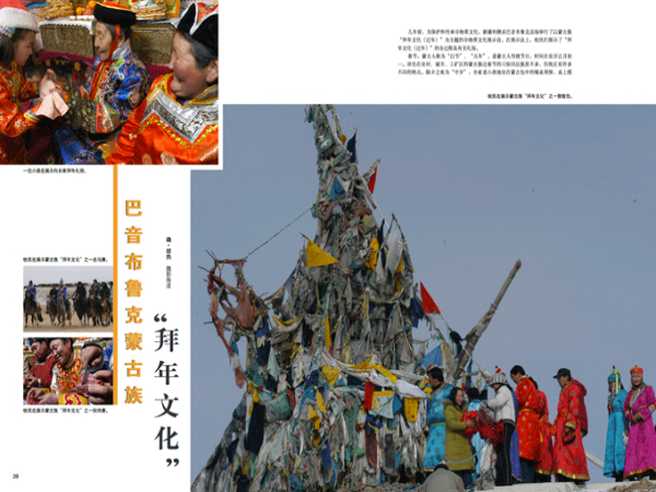 幾年前,為保護和傳承非物質(zhì)文化,新疆和靜縣巴音布魯克總場舉行了以蒙古族“拜年文化(過年)”為主題的非物質(zhì)文化展示會。在展示會上,牧民們展示了“拜年文化(過年)”的全過程及有關禮俗。