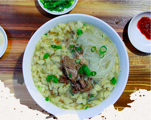 饃掰好后,請伙計呈給掌勺大廚,加羊肉湯大火快煮,加牛羊肉、粉絲、蔥花、蒜苗、香菜,優(yōu)質(zhì)的還有木耳、黃花菜和香干等即可端上來吃了。這樣一大碗自己親手掰好的泡饃,翠綠的蔥花、蒜苗、香菜、紅褐色的牛羊肉、黃色的金針菜、映襯著潔白晶瑩的粉絲、黝黑的木耳、香味四溢,。還應(yīng)注意的是:端上來的泡饃應(yīng)是泡饃墊底,粉絲覆成網(wǎng)形,佐以蔥花、香菜、牛羊肉擺成魚形在最上面,吃時左手拿勺,右手執(zhí)筷。泡饃上桌后,把辣子醬鋪在上面,切忌攪動,講究從一邊“蠶食”,以保持鮮味。糖蒜用否,個人自愿。餐后飲用一小碗原汁烹制而成的高湯,以為清口。