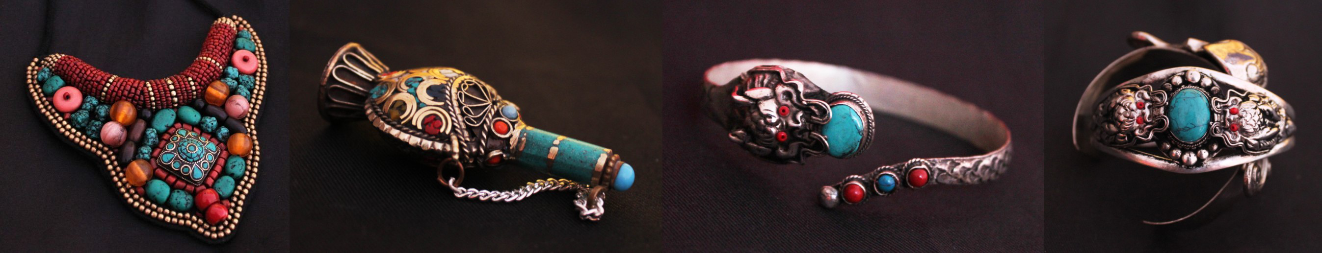 天然石頭、珊瑚、動(dòng)物骨頭、白銀是制作藏飾的主要原料,就是這些平實(shí)的材料,粗糙的外表卻有精致的內(nèi)涵。細(xì)小的花紋、鏤刻、鑲嵌,都巧妙地形式藏飾的設(shè)計(jì)風(fēng)格,并散發(fā)出濃烈的古、土味。所有藏飾均是手工完成,好多藏飾是喇嘛在廟里打造出來(lái)的,每一件都是與眾不同。