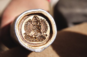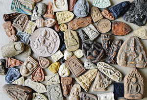 我在曼谷一家有40年歷史的佛像店“佛光工藝社”采訪時問到老專家這樣一個問題:泰國現(xiàn)在大概有多少種圖案的帕肯?所有聽到這個問題的人都是一聲驚嘆,然后笑說:“無數(shù)!”我非要問出個數(shù)來,他們便告訴我,泰國是一個歷史劃分復(fù)雜、族源廣博的國家,因此其包容性很強,雖然九成以上的人信仰佛教,但是婆羅門教、道教、伊斯蘭教、基督教等在泰國都被接納,還有本土的一些法術(shù)也不曾被丟棄。所以,每天每個來定做的人都會有不同材質(zhì)的要求,不同圖像、符咒的組合,僅一個工藝社40年來就已經(jīng)做過幾十萬種的圖案組合。我收藏的擦擦有不同年代、不同材質(zhì)、不同價值的,除去年代久遠(yuǎn)的,頗有價值的就是一個藥擦,那是一個大威德金剛擦,專家說從被剝落的剖面看,里面有藥材的成分。我知道,在西藏,擦擦因材質(zhì)和制作人不同而有很大的區(qū)別。擦擦中最為稀有難求的一種叫“布擦”,那是寺廟僧人在保存活佛法體的時候,將那些浸透活佛法身血水的鹽巴或其它藥物和泥土融合后制成的。另一種較為珍貴的擦擦是活佛的骨灰與泥土摻混在一起制作而成的。還有一種藥物擦擦,是用不同的名貴藥材如珍珠、瑪瑙、藏紅花等藏藥合成制作,可服用治病。最普通的擦擦用一般的泥土制作,好一點的有膠泥、陶土、白泥等,這種擦擦成本低廉,在民間流傳最廣。