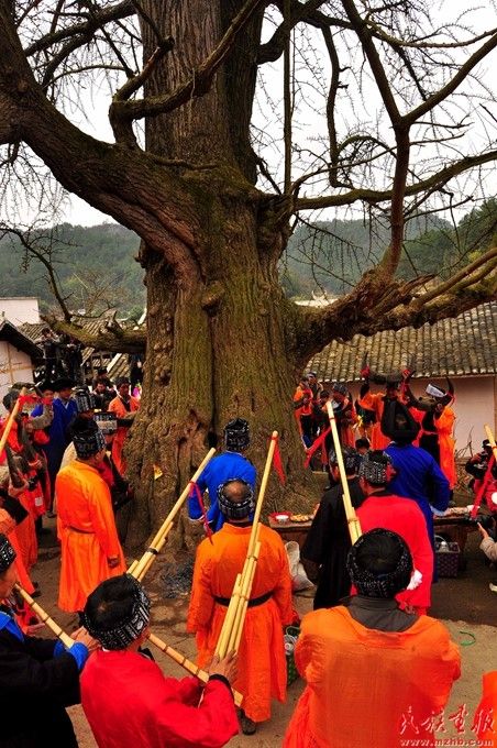 苗族寨老引領(lǐng)眾人來到寨中央的千年銀杏樹下進行祭樹,寨老高舉牛角、男人們吹起蘆笙圍著古樹轉(zhuǎn)圈,司儀唱起“古歌”祈禱。寧堅攝影,引自民族畫報