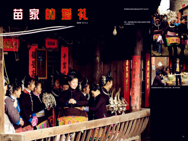 第二天是新娘出嫁的日子。早上七點(diǎn),新娘的姑嫂和姐妹就早早地來(lái)到新娘家為新娘梳妝打扮,有的給新娘梳頭,有的給新娘穿衣,有的給新娘佩帶銀飾,女孩子們唧唧喳喳一陣熱鬧。經(jīng)過(guò)一個(gè)多小時(shí)的梳妝打扮,新娘就要出門了。