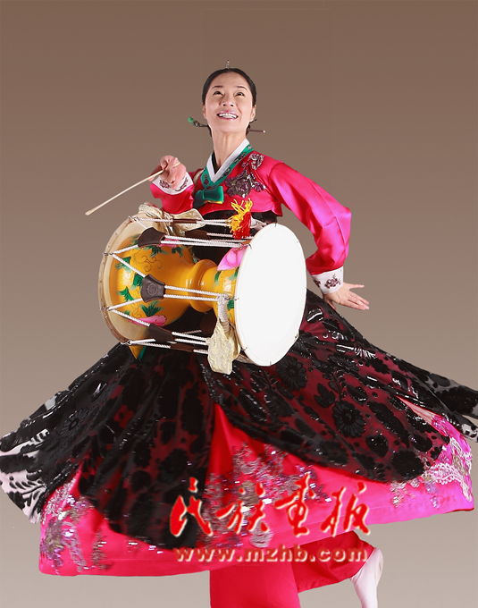 長(zhǎng)鼓舞和象帽舞其實(shí)都源于傳統(tǒng)的農(nóng)樂(lè)舞。早先,長(zhǎng)鼓舞是農(nóng)樂(lè)舞的一個(gè)部分,20世紀(jì)初,由于其獨(dú)特的舞蹈形態(tài),長(zhǎng)鼓舞從農(nóng)樂(lè)舞中脫穎而出,成為一種獨(dú)立的民間舞蹈,備受朝鮮族群眾的喜愛。舞臺(tái)上,那腰掛火紅長(zhǎng)鼓的姑娘一道明媚的眼神、一個(gè)華麗的轉(zhuǎn)身,都引得觀者癡癡凝望;那一陣緊似一陣、一聲響似一聲的敲擊,聲聲清脆,直撞你的心房,令你目眩神迷、心旌搖蕩!