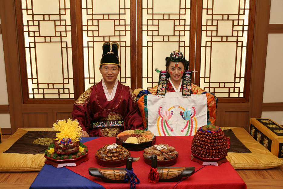 定婚前,提親、定吉日、送聘禮等程序是不能少的。這一環(huán)節(jié)一個重要的禮節(jié)叫作“納彩”,指的就是定婚時,男方家向女方家提親送禮物。朝鮮族姑娘和小伙子的接觸傳話,需要一個“媒人”。與漢族的“相親”相似,男方家要讓媒人到女方家“看善”,如果滿意,小伙正式向姑娘求婚,女方若也同意,男方家就往女方送“四柱”。四柱就是在一張紙上寫著姓名和星辰宿象(出生的年月日時),女方再拿姑娘的四柱與之對“穹合”。所謂“穹合”,就是指男女的屬相是否相順而不相克。