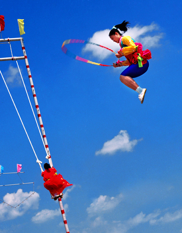 民間跳板長5.5米、寬4.0厘米左右,厚5.0至6.0厘米。跳板中間的下面立板墊,高3.0厘米。比賽時有專人守護板墊,防止跳板掉下。站在跳板兩端的姑娘輪番連續(xù)起跳,逐漸將對方彈送得更高。在身體騰空時能表演出驚險動作者最受歡迎,如剪式跳、旋轉(zhuǎn)跳、空翻跳,甚至跳藤圈、做造型、舞花環(huán)、揮彩帶等。靈巧優(yōu)美、五彩紛呈,令人眼花繚亂,驚嘆贊賞。