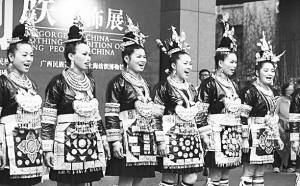 2015年5月23日,由貴州省民族博物館、廣西民族博物館和上海紡織博物館聯(lián)合主辦的“絢彩中華——中國(guó)侗族服飾文化展”在上海紡織博物館舉行。本次展覽共展出近200件套侗族服飾,代表了不同時(shí)代、不同地域、不同支系、不同功能的侗族服飾。展期為期60天。圖為來(lái)自貴州黎平縣三龍村的侗族姑娘們,邊唱著侗族大歌,邊向觀眾們展示美麗的侗族服飾。