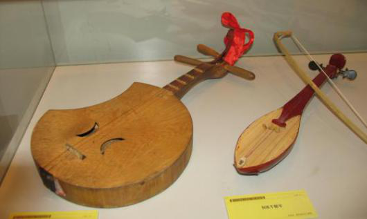 侗琵琶:彈撥樂器,侗語稱“必巴”,漢語稱“侗琵琶”,有大、中、小三種類型。形狀與三弦相似,用牛角撥片演奏。常用于獨奏及侗歌伴奏(圖為侗琵琶和牛腿琴)。
