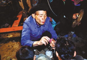 這天,我們剛好在縣里采訪,聽說(shuō)高良鄉(xiāng)瑤族村寨要舉行度戒活動(dòng),于是就直奔瑤寨而去。一進(jìn)寨子,馬上感覺(jué)氣氛不同?,幾鍕D女們頭戴別致的大銀盤,身著盛裝,真像過(guò)節(jié)一樣。經(jīng)了解后,得知寨子里共有十幾個(gè)男孩要參加這次度戒。寨子里的一位老人告訴我們,一般情況下,只是兩三人,這樣多的男孩一同舉行度戒儀式是很難碰到的??磥?lái),我們的運(yùn)氣還真不錯(cuò)。我們來(lái)到度戒地點(diǎn),見到將要度戒的十幾個(gè)男孩集中在一起,用棉被蒙著頭,不能見陽(yáng)光,要等儀式完后,才能見陽(yáng)光。