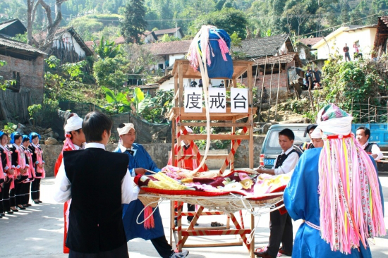 “度戒”臺(俗稱“巫臺”,亦稱“神臺”或“五臺山”)設(shè)在村子下面的一塊小地里,因這次有兩人“度戒”,便并列設(shè)了兩個“巫臺”。“巫臺”搭得較簡單,先在場地上打4棵木樁,用四方桌作臺頂,桌子的4腳分別捆在木樁上,臺高約4米;“巫臺”前搭有一架有5個臺階的木梯,等“度戒”者送上臺后便把木梯砍掉;臺后有一張用大青藤編成的狀如蛛網(wǎng)的大網(wǎng),上面鋪著幾床新被子,約有10人對稱拉開,等“度戒”師下令,“度戒”者從“巫臺”上仰面滾落下來。拉網(wǎng)的人乘“度戒”者墜落進網(wǎng)之勢,把他輕放于地上,并將手中之繩速向?qū)Ψ綊仈n,“度戒”師看了其落地的姿勢可以,此次“度戒”便算成功了。