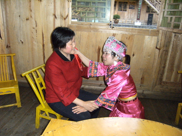 哭嫁歌內(nèi)容有“母女對哭”“嫂妹對哭”“姐妹對哭”“哭離娘席”“哭別祖宗”“哭兄弟”“哭梳頭”“罵媒人”“哭上轎”等,甚至還有同村同齡未婚姑娘的群哭——“哭十姊妹”??藜薷柙从谕良易骞媚锍黾耷暗目藜拗祝绞桥R近婚期,哭聲越悲,甚至通宵達旦。2010年,“土家族哭嫁歌”已被列入第三批國家級非物質(zhì)文化遺產(chǎn)名錄。